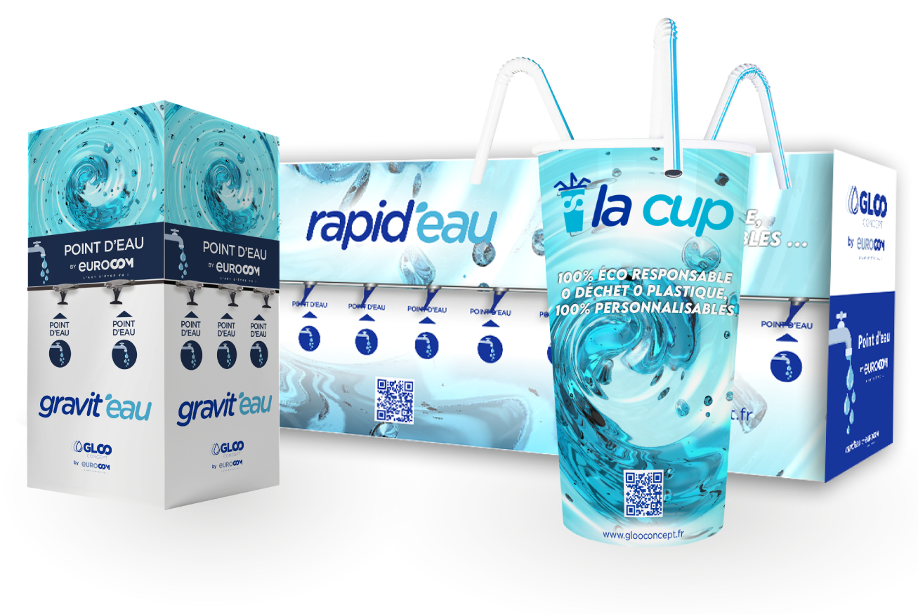 Gloo Concept by Eurocom a la solution pour la partie distribution d’eau et élimination des déchets plastiques à usage unique qui est l’un des cinq axes majeurs de la loi anti gaspillage.
